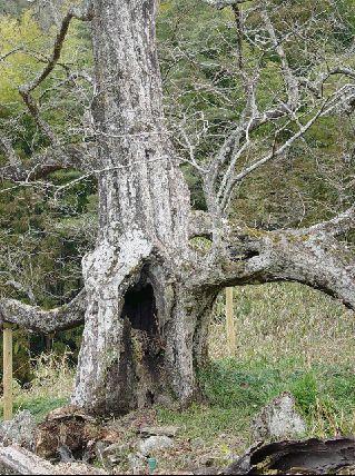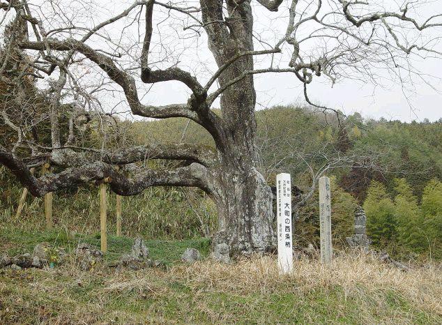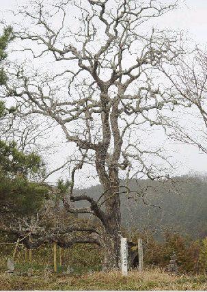 瀬川さんの「九州巨木の旅」の始まりである。といっても、最初は途中で立ち寄られた岡山県から始まる。 全国に柿の巨木は幾つかあるが、西条柿では日本一と言われる巨木が、岡山県鏡野町大町にある。樹高17m、幹周4.47mで、樹齢は400年と推定され、鏡野町の天然記念物に指定されている。根元には接ぎ木の跡がある。毎年4トンもの柿のみを付けるそうである。鏡野町には、柿の他に、幹周9.5mのムクノキ(国司のムクノキ、高山神社)、幹周6.3mのスダジイ(寺和田)等の巨木がある。 中国縦貫道路で津山に近い「院庄インター」で降りて、179号線を3kmあまり北上して寺元から392号線に入る。北に向かって山間を10kmほど進み、更に進路を北東にとって4kmほど進むと、鏡野町大町である。大町の大柿地区に、この西条柿の巨木が待っている。 |