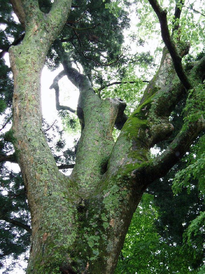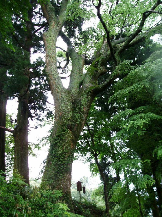 Mukaiさんに送っていただいた三重県の次の巨木は、「真福院の大ケヤキ」である。三重県と奈良県の県境近くの美杉村(合併して津市美杉町となった)には、前回ご紹介した「国津神社の大ケヤキ」もあり、ケヤキの巨木が多い。真福院の大ケヤキは樹高35m、幹周6.3mで県の天然記念物となっている。Mukaiさんからのメールには「苔生した白い幹がいかにも樹齢を感じさせ、西側の崖の下から眺める姿に迫力がありました。このケヤキも鮮やかな新緑が綺麗でした。」とある。 伊勢多気と伊賀上野を結ぶ国道368号線の県境近くに美杉町三多気がある。ここは日本桜100選にも選ばれている三多気の桜でも有名である。368号線を奈良県側に向かって進むと、県境から300mほど東に杉平の交差点がある。ここを北に曲がって、道が細くなってもそのまま(約1km)進むと左手に真福院が見える。 |
