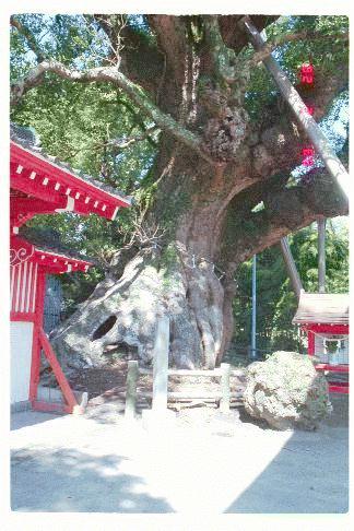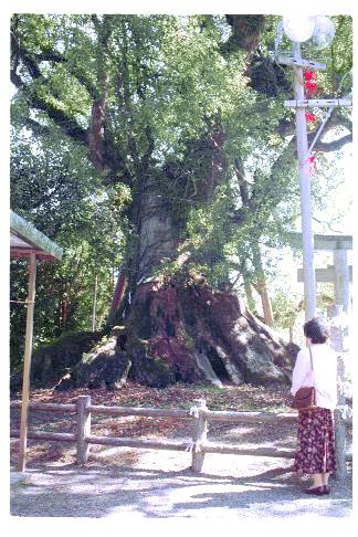 久しぶりに鹿児島の田平さんから写真が届いた、志布志の大クスである。 樹高24m、目通り幹周り17.1m、樹齢は800−1000年と推定されている。 鹿児島県では蒲生の大楠に次いで、クスノキとしては第二位、全樹木中では 第三位の大きさである。国の天然記念物に指定されている。 宮崎市から出るJR日南線の終点の志布志駅で降りて、北西に3km、安楽という村の 山宮神社の境内右手に大クスが聳えている。例に漏れず、 根元は大きな空洞になっているが、樹勢はなかなかのものである。 |