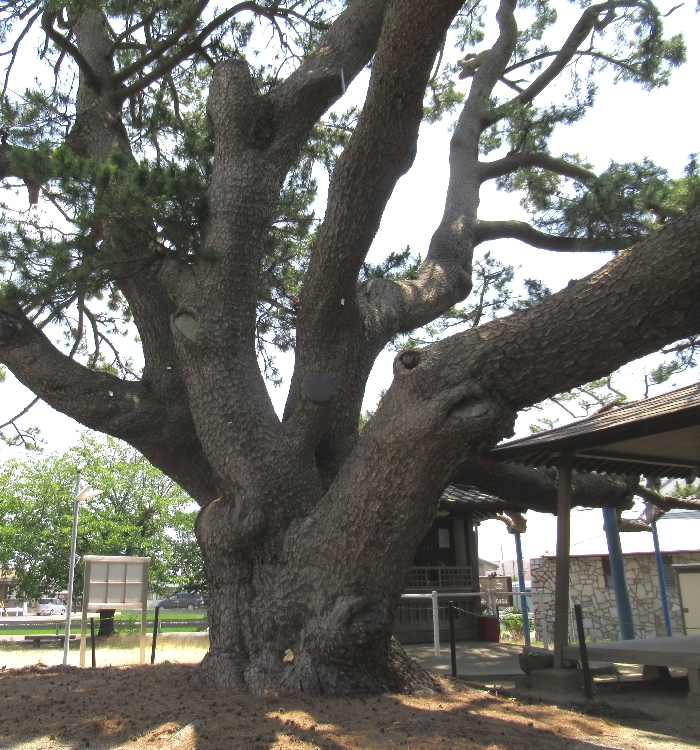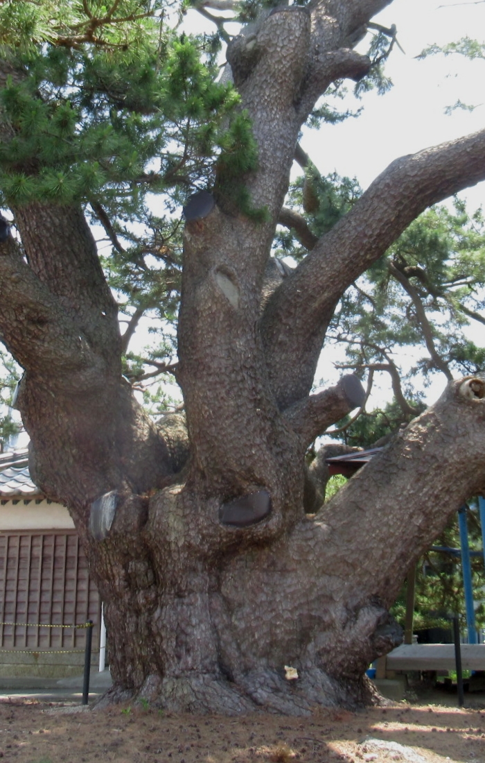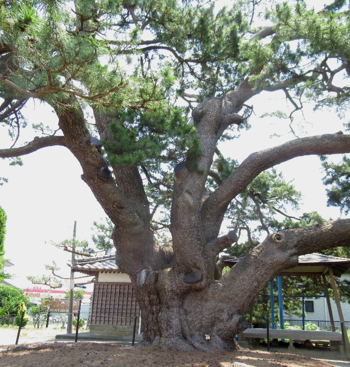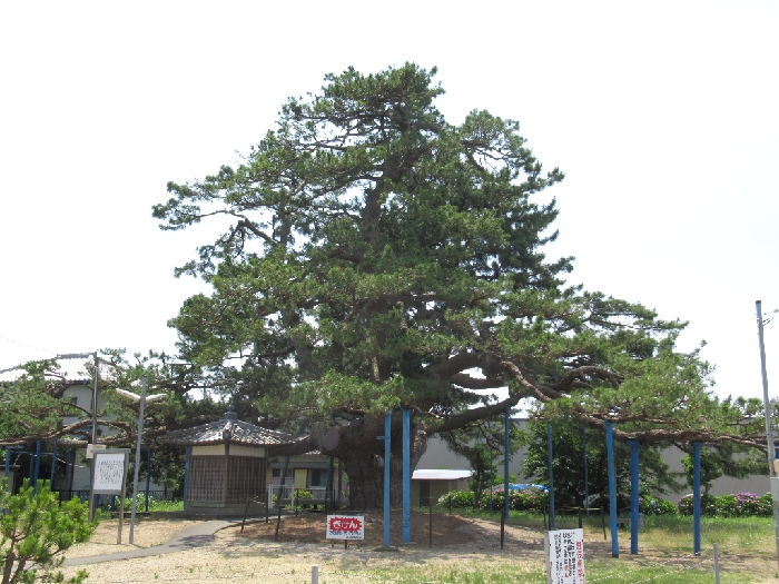 三重県鈴鹿市の白子に鈴鹿医療科学大学がある。元NTTのあった広大な敷地に近代的な建物が配され、緑も多いのどかな大学である。この大学のすぐ北に「地蔵大松」がある。2002年に小森さんが見事な写真を送って下さって以来、一度見たいものと思っていた。今回、鈴鹿医療科学大学の川西正祐先生に呼んで頂いたのを機会に、一緒に徒歩で出かけた。思い描いていたとおりの巨大な松で、二人でしばし見とれた。 アカマツでは幹周7.1m(宮 誠而氏の「巨木学」による)の東法田の大アカマツが日本最大であるが、クロマツではこの地蔵大松が日本最大である。香川県にあった岡野の松、円通寺の松が枯死したのにたいして、地蔵大松は保存会の手入れのお陰で健康そのものに見えた。案内板によれば、幹周6.7m、樹高20mで三重県の天然記念物に指定されている。蘇我氏が物部氏を滅ぼした後、地蔵菩薩信仰が禁止されたため、地蔵を埋めて隠し、目印にこの松を植えたと伝えられるので、樹齢は1300年を越すことになるが、実際にはずっと若いであろう。 近鉄白子駅で降りて、鈴鹿中央病院行きの三重交通バスに乗り、西玉垣町で降りると、西に200m程である。バスは1時間に1,2本出ている。 |