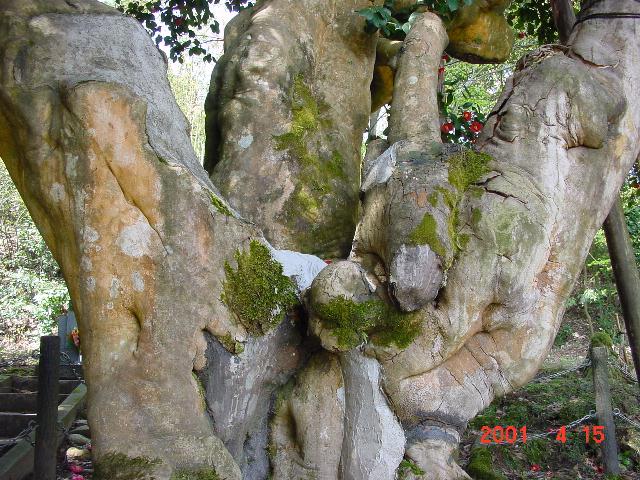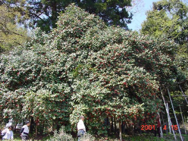 「巨木探訪」の中に椿の巨木が少ないのを残念に思っていたら、鮒池さんから椿の写真が届いた。「巨樹の一角に椿の頁もあればと思います。」とお便りにあった。嬉しいことである。 鮒池さんの送って下さった名標によれば、「老谷(おいだん)の大椿」は2本からなるが、大きい方が県の天然記念物に指定されており、樹高6.6m、幹周り3.47m、樹齢は500年以上とされ、日本最大の椿と言われる。写真のように東西8m、南北11mに広がって森のような様相を呈している。樹種は「ヤブツバキ」である。 高さ80cmの所から幹が3本に分かれ、それぞれが写真のようにくねって異常な形をしているので、別名を「刺股の椿」と呼ばれている。戦国時代、飢餓に苦しむ民のために城主に直訴した家老が切腹を命じられ、老谷の飯原家から嫁いでいた妻は幼子をつれて老谷に逃げ、夫の非業の死を悲しみながら亡くなった。墓石の代わりに椿を植えたところ、成長するにつれて椿は異様な形となり、妻の恨みがこもっていると言われるようになったという。 JR氷見線の氷見駅で降りて西方16km、タクシーで30分かかる。車なら、氷見駅から415号線に沿って西に走り、谷屋で左折、更に触坂から道を右にとって、岩瀬の行願寺の手前から細い道を北西に入っていく。 |