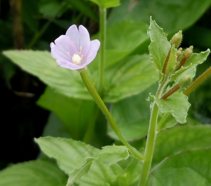 イワアカバナ−岩赤花| 1000mを超す山に登るとよく見かける花である。淡紅色あるいは白色の小さな花が長く伸びた花茎の先端に付いている。花がポロリと落ちた後の花茎が棒のように伸びて残ることから、すぐにアカバナ属の花であるとわかる。葉は茎を抱き、長楕円の披針形で縁には小さな鋸歯がある。茎は赤みを帯びることが多い。 アカバナ属にはアカバナ、ミヤマアカバナ、トダイアカバナなどがあるが、雌しべが棍棒状(最下段のアカバナ参照)でなく、丸い頭状になっているのはイワアカバナだけであるので、区別が付く。花弁は4枚で、先端が窪んで2つに割れている。 学名は Epilobium cephalostigmaで、アカバナ科アカバナ属の多年草である。花期は7−8月。日本全土の山地に生える。 |