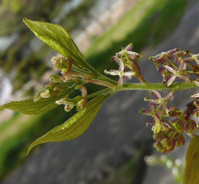 エノキの花。右手の十字は雄花、左の花は両性花で枯れた雄しべと子房が見える(山田池公園 2011.4.21)