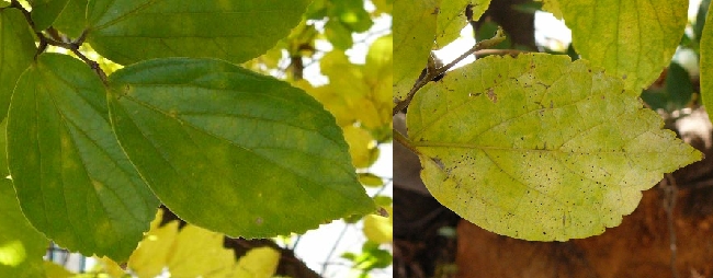 エノキの葉(左が表、右が裏)−互生し、縁の上部に鋸歯がある
