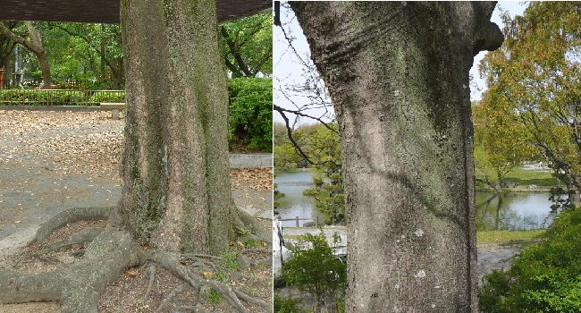 エノキの幹−成木では水平に皺が入る。根方は割れて鈍い板根状になる