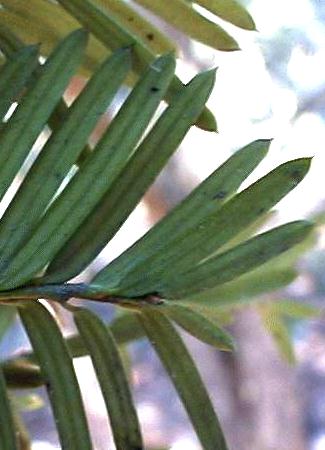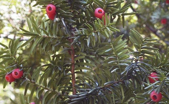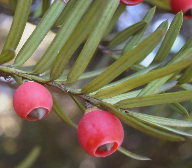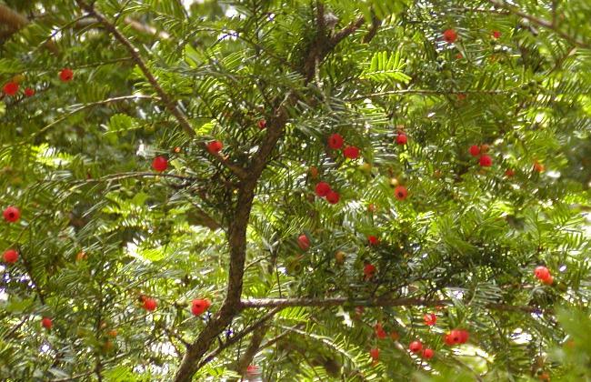 日本全土の山に分布する常緑高木で大きいものは20mにもなる。樹皮は赤みがかって荒い。庭木や垣根にも使われるので、秋の赤い実は街でもよく見かける。雌雄異株で、3-4月に葉の付け根に花が付く。雌株の場合には9-10月に色付いて、厚みのある赤い仮種皮が種子を覆う。仮種皮は甘い味がし、食することが出来るが、種子は有毒である。。 学名はTaxus cuspidataで、イチイ科イチイ属である。cuspidataは、「急に細くなる」の意で、葉の付け根のことを指すのであろうか。別名を、オンコ、アララギとも言う。 |
