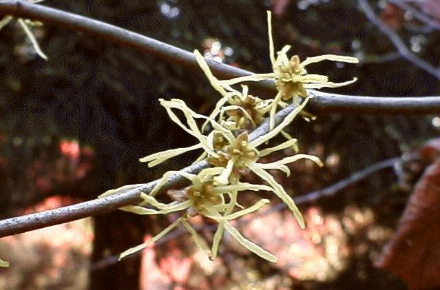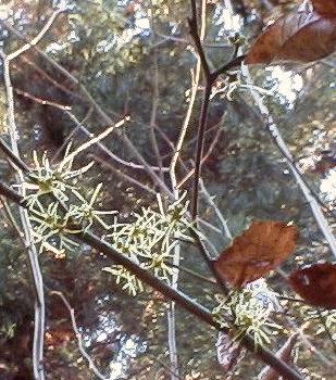 学名はHamamelis virginianaで、マンサク科マンサク属である。 日本で見られるマンサクの学名はHamamelis japonicaであるので、この木は アメリカのVirginia周辺の原産であろう。 |