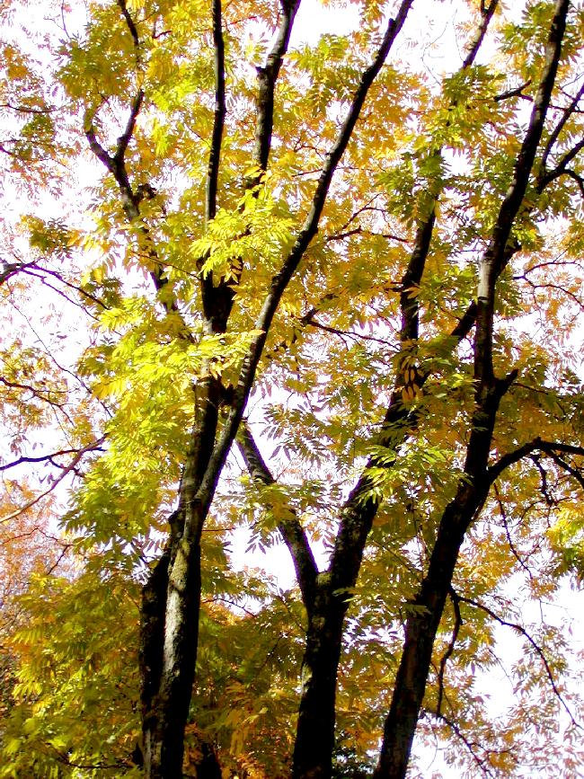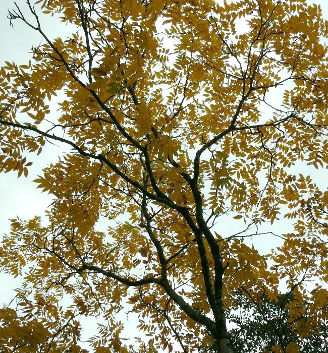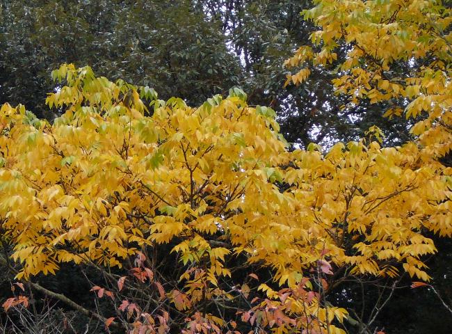 山地に生える落葉高木。葉は長く5-15cmで、丁度ニワウルシやカラスザンショウのように互生する。秋の黄葉が特に美しい。 6月、枝先に大型の円錐花序を付ける。果実は直径2cmの球状で、中の黒い種子は羽根つきの球によく使われた。 学名は、Sapindus mukorossiで、ムクロジ科ムクロジ属である。Sapindusは「インドの石鹸」の意味で、ムクロジに含まれる化学物質サポニンは水に溶けると泡立ちがよい。黄葉は京都府立植物園と京大理学部附属植物園で撮した。 |