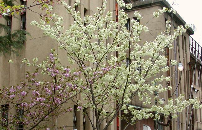 昨年は黄色い桜である「鬱金」を掲載したが、「御衣黄」も載せてほしいというご注文を頂いた。京都府立植物園の北門を入って西側の桜園に、その御衣黄がある。普段は柵がしてあるので入れないが、桜が満開の季節だけ、柵の一部を取り去って入ることが出来るようにしてある。なかなか良い工夫だと思う。花は、やはり、近くでその妙なる姿を見たいものである。2本の御衣黄のうち、一本はまだ蕾であったが、もう一本は3分咲きで、一年ぶりに宿題を果たすことが出来た。 昨日、四条へ行くバスがなかなか来ないので、業を煮やして三条行きに乗り、一条分を歩くことにした。三条京阪から大橋を渡って木屋町の高瀬川沿いを四条に向かう途中で、ふと目を上げると、なんと、そこに御衣黄が満開であった。立誠小学校という古い小学校がそこにあるが、学校内の北東角に見事に咲いていた。なんとも不思議な出合であった。 もう一つ、JR京都駅の八条口の西800mほどの所に、六孫王神社がある。この境内にも、御衣黄があって、これも今盛りということである。 御衣黄は、オオシマザクラ系サトザクラの園芸品種で、鬱金と共に、花の色が珍しいので、珍重される。花の中心部は、最初白いが、満開になると次第に赤みを帯びてくる。満開の立誠小学校のものは、すでに中心部が赤くなっている。 学名はPrunus lannesiana cv. Gioikouで、バラ科サクラ属である。 |