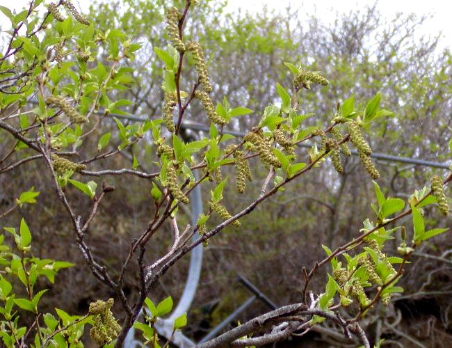 ヤシャブシの中では最も早く3月はじめには花を付けるのが、オオバヤシャブシで、南関東から紀州の海岸沿いの山地に生える落葉小高木である。カバノキ科特有の懸垂した黄色の雄花序を付けるが、ヤシャブシやヒメヤシャブシに比べると雄花は太くて短い。 雄花序の上に付く雌花からは、写真のような丸い果穂が育つ。葉は名前のように他のヤシャブシより少し大きい。 学名はAlnus sieboldianaで、カバノキ科ハンノキ属である。sieboldianaは「シーボルトによって記録された」の意。 |