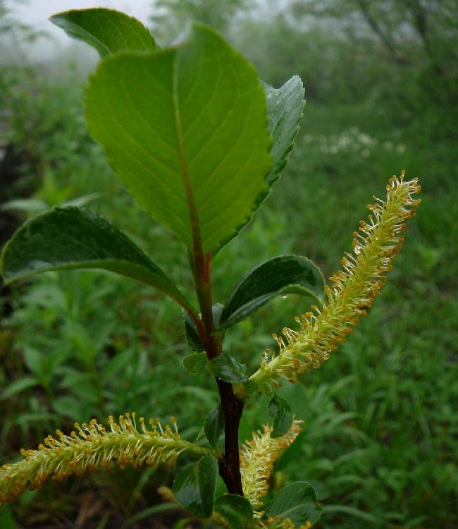 雨の立山弥陀ヶ原を歩いた。せっかくのチングルマの群生も雨で雄蘂が駄目になっていたが、幾つかの木々を写すことが出来た。その一つがミヤマヤナギである。高度の高いところでは地を這うように枝を伸ばすが、この辺りでは低いながらまだ立木である。特徴としては根元からの分岐が多い。 鋸歯を持ち、互生する葉は、枝先の方が大きい特徴がある。6-7月、葉の展開と同時に尾状の花を立てる。雌雄異株で、雄花序では葯の黄色が目立つが、雌花序は緑色に見える。写真の木は雄株である。 ヤナギ属の木は似たものが多い。オオネコヤナギも形が似ているが、葉の展開がやや遅い。ヤマヤナギにも似ているが、こちらは分布が西日本である。 学名はSalix reiniiで、ヤナギ科ヤナギ属の落葉低木である。中部地方以北の本州の山岳部、北海道に分布する。 |